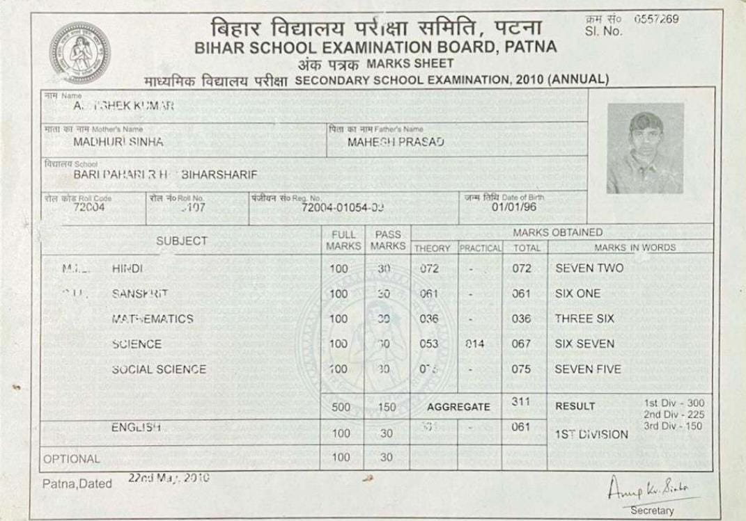 | Exam | Full Marks | Pass Marks | Marks Obtained |