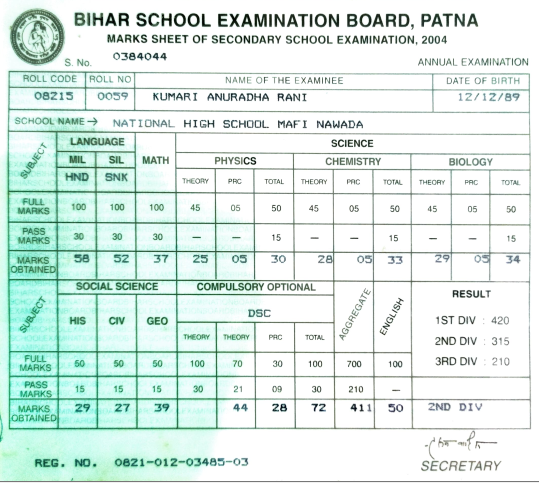 | Exam | Full Marks | Pass Marks | Marks Obtained |