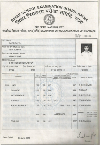 | Exam | Full Marks | Pass Marks | Marks Obtained |