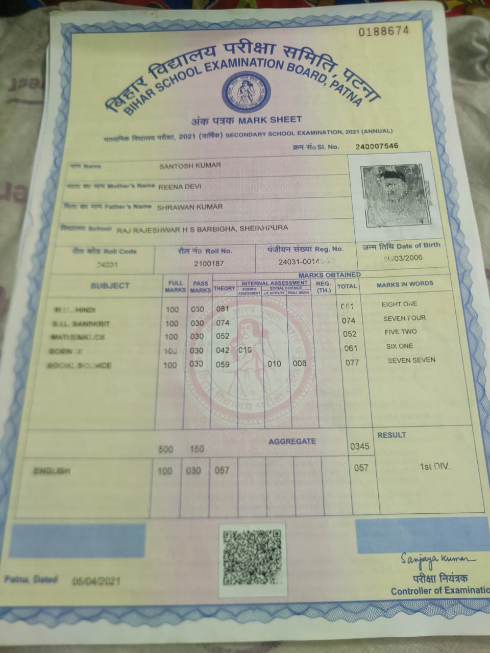 | Exam | Full Marks | Pass Marks | Marks Obtained |