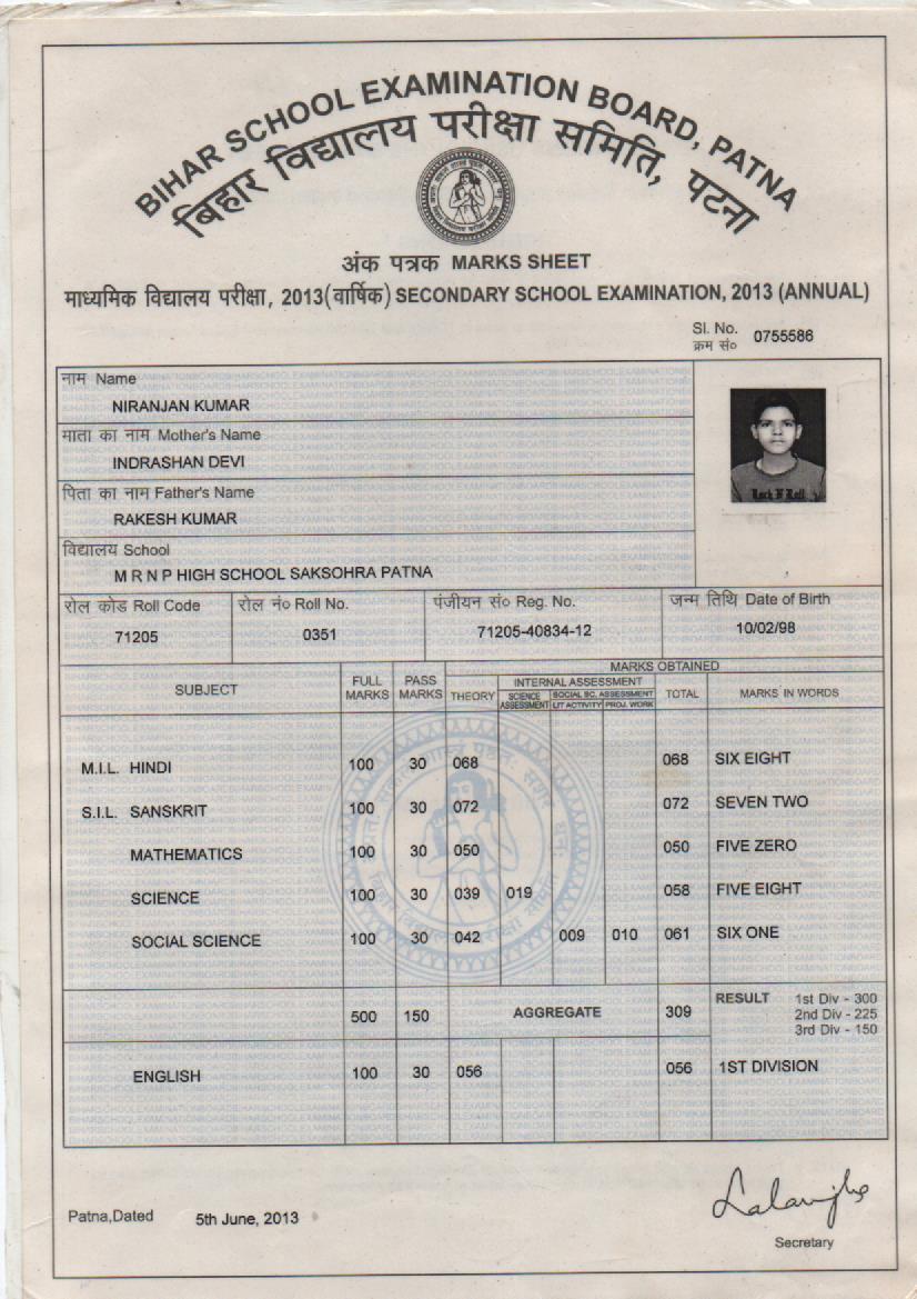 | Exam | Full Marks | Pass Marks | Marks Obtained |
