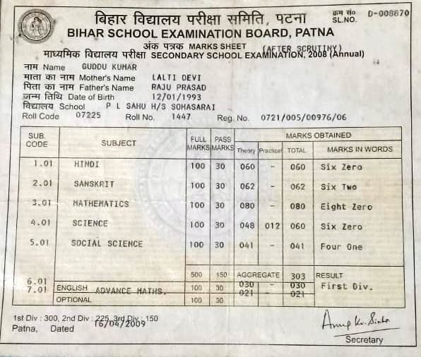 | Exam | Full Marks | Pass Marks | Marks Obtained |