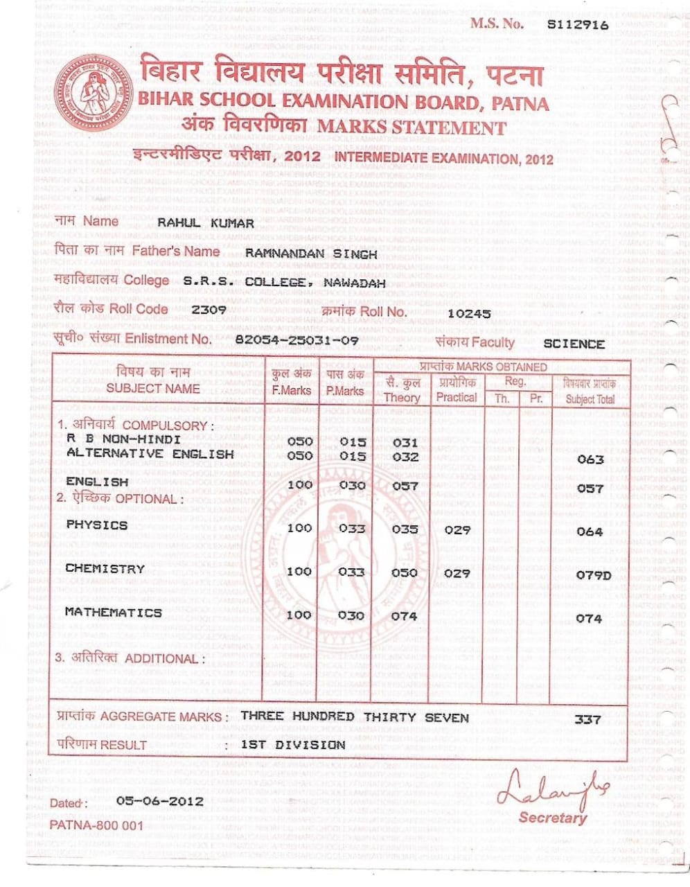 | Exam | Full Marks | Pass Marks | Marks Obtained |