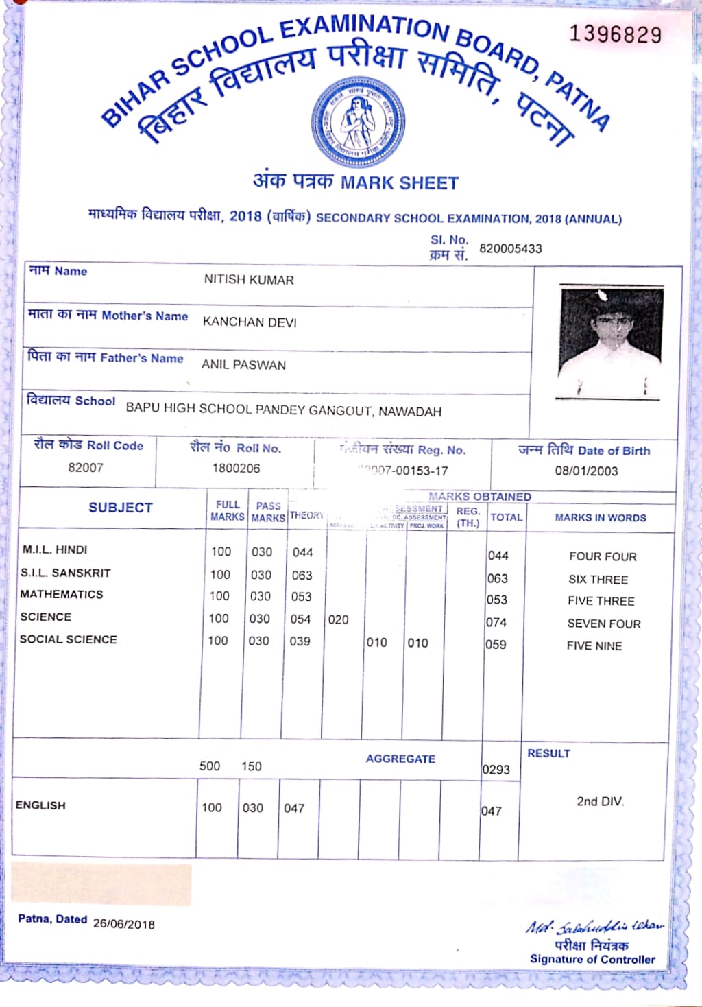 | Exam | Full Marks | Pass Marks | Marks Obtained |