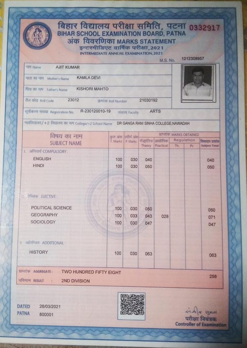 | Exam | Full Marks | Pass Marks | Marks Obtained |