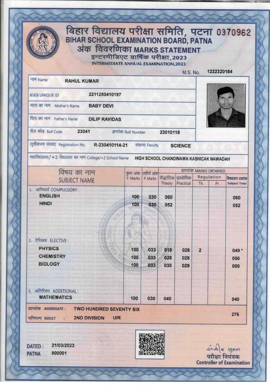| Exam | Full Marks | Pass Marks | Marks Obtained |