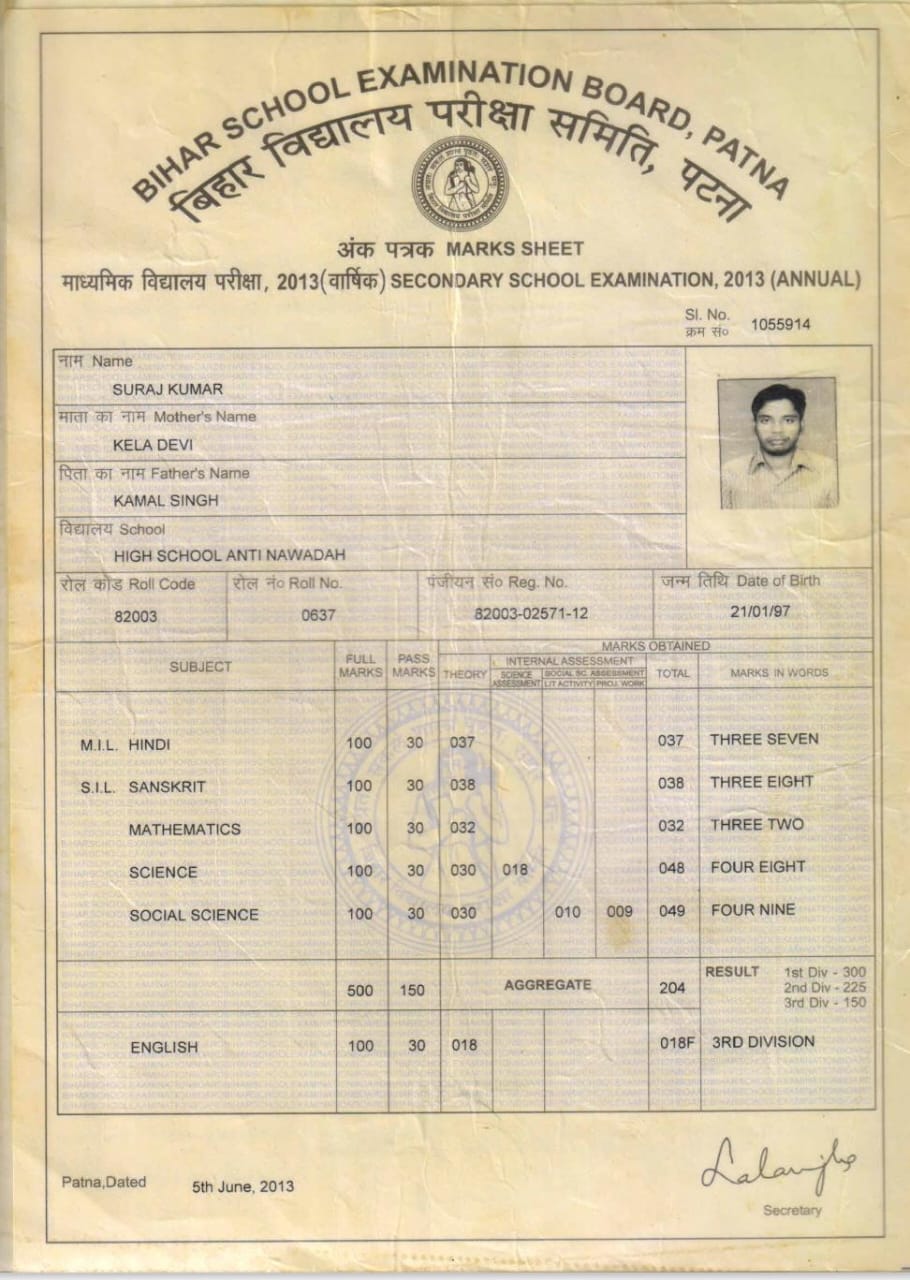 | Exam | Full Marks | Pass Marks | Marks Obtained |
