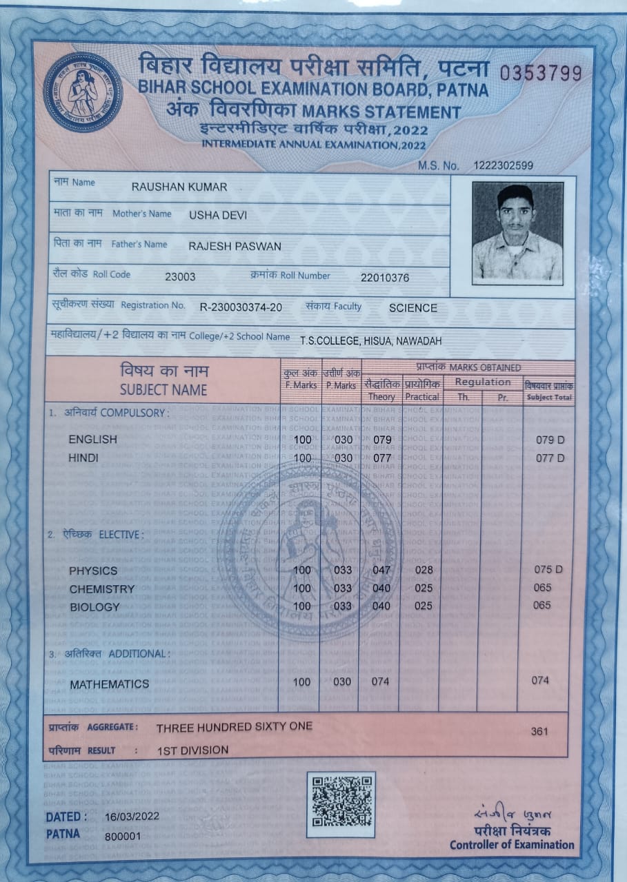 | Exam | Full Marks | Pass Marks | Marks Obtained |