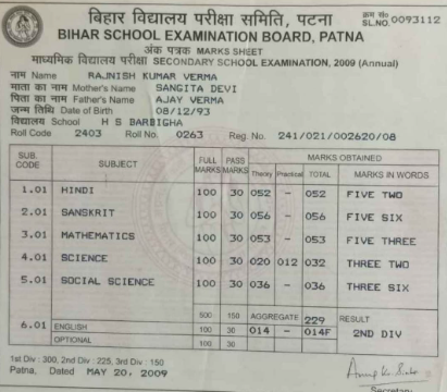 | Exam | Full Marks | Pass Marks | Marks Obtained |