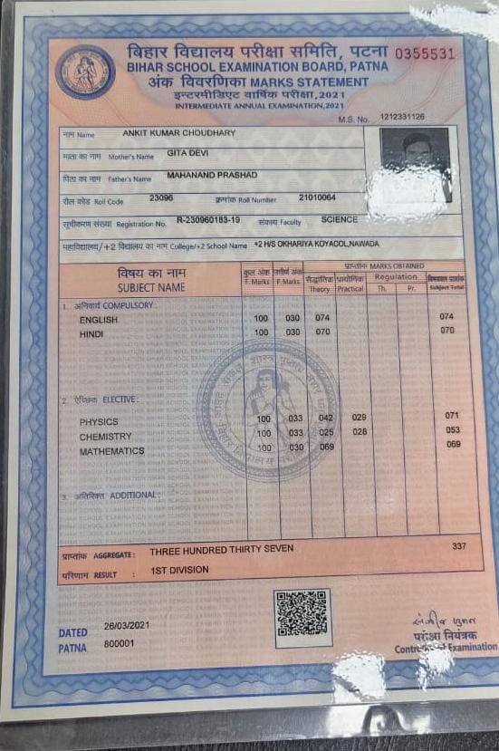 | Exam | Full Marks | Pass Marks | Marks Obtained |