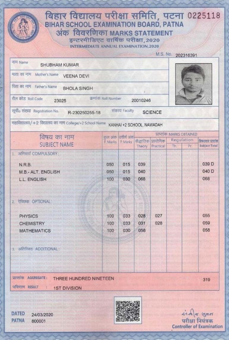 | Exam | Full Marks | Pass Marks | Marks Obtained |