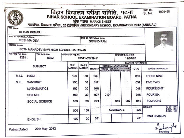 | Exam | Full Marks | Pass Marks | Marks Obtained |