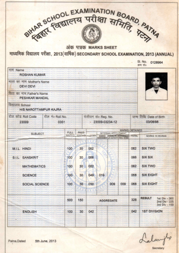 | Exam | Full Marks | Pass Marks | Marks Obtained |