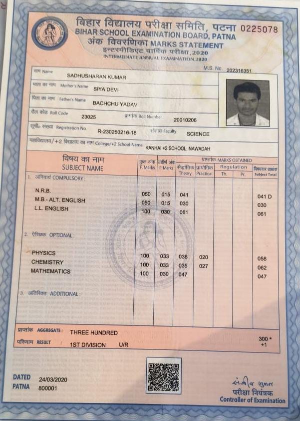 | Exam | Full Marks | Pass Marks | Marks Obtained |