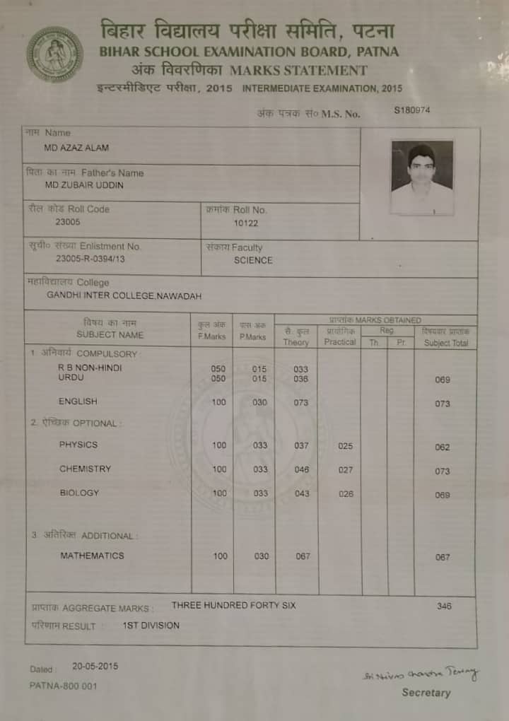 | Exam | Full Marks | Pass Marks | Marks Obtained |