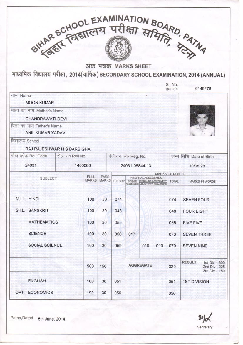 | Exam | Full Marks | Pass Marks | Marks Obtained |