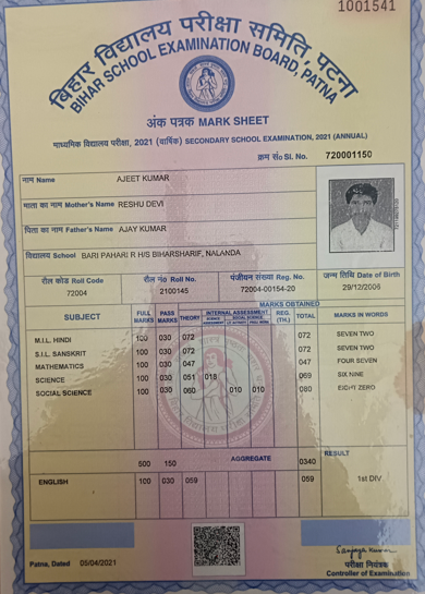 | Exam | Full Marks | Pass Marks | Marks Obtained |