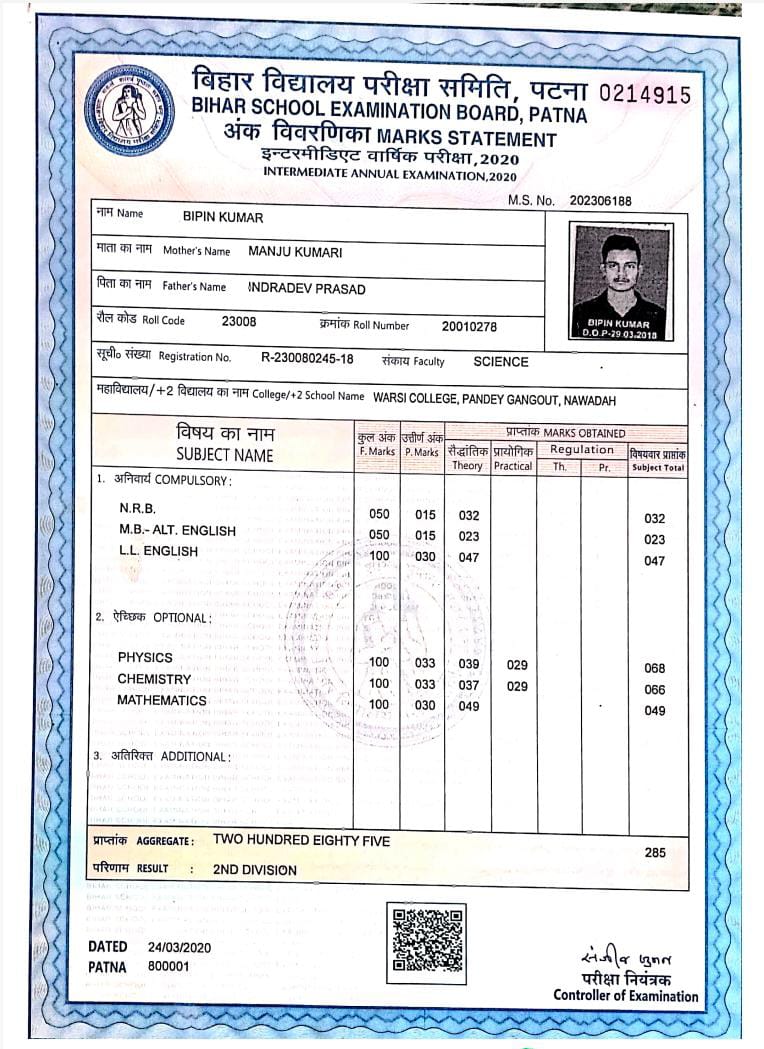 | Exam | Full Marks | Pass Marks | Marks Obtained |