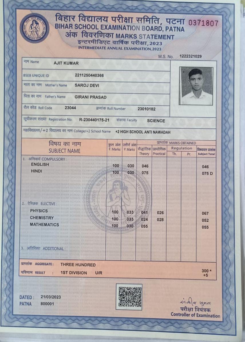 | Exam | Full Marks | Pass Marks | Marks Obtained |