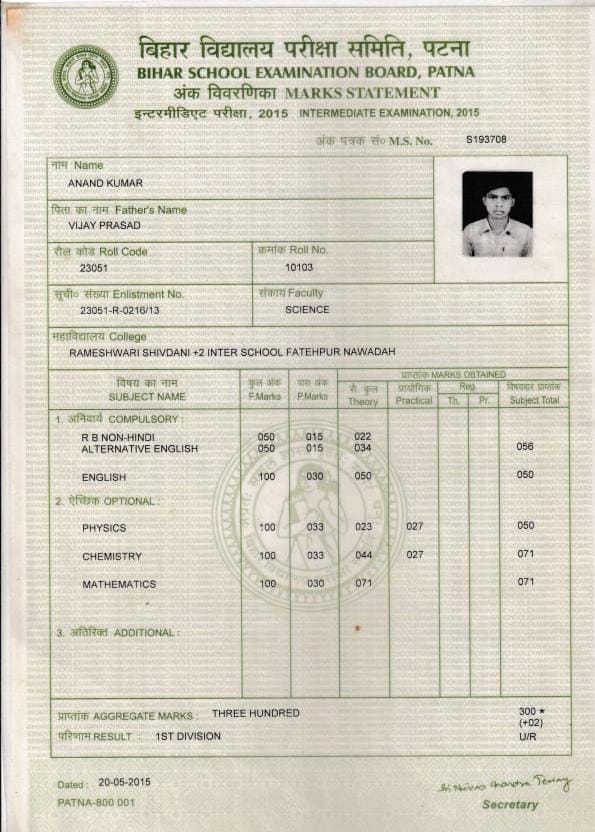 | Exam | Full Marks | Pass Marks | Marks Obtained |