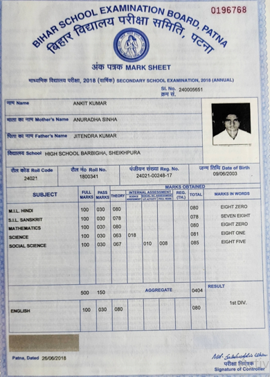 | Exam | Full Marks | Pass Marks | Marks Obtained |