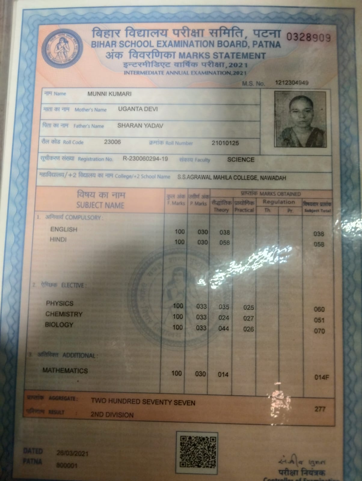 | Exam | Full Marks | Pass Marks | Marks Obtained |