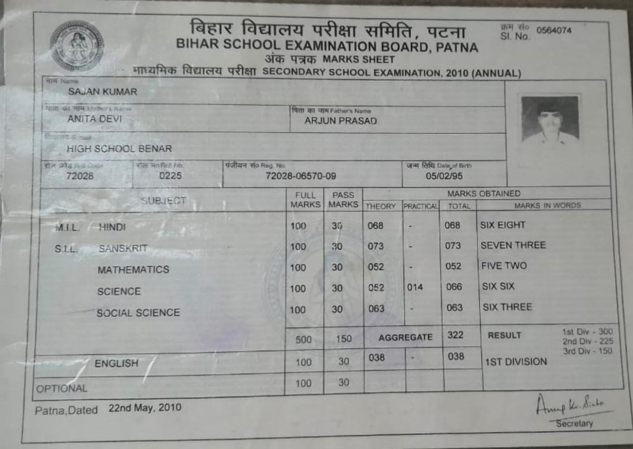 | Exam | Full Marks | Pass Marks | Marks Obtained |