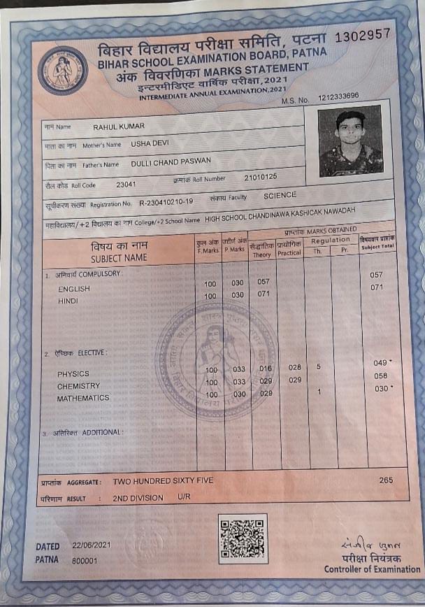 | Exam | Full Marks | Pass Marks | Marks Obtained |