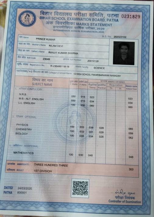 | Exam | Full Marks | Pass Marks | Marks Obtained |